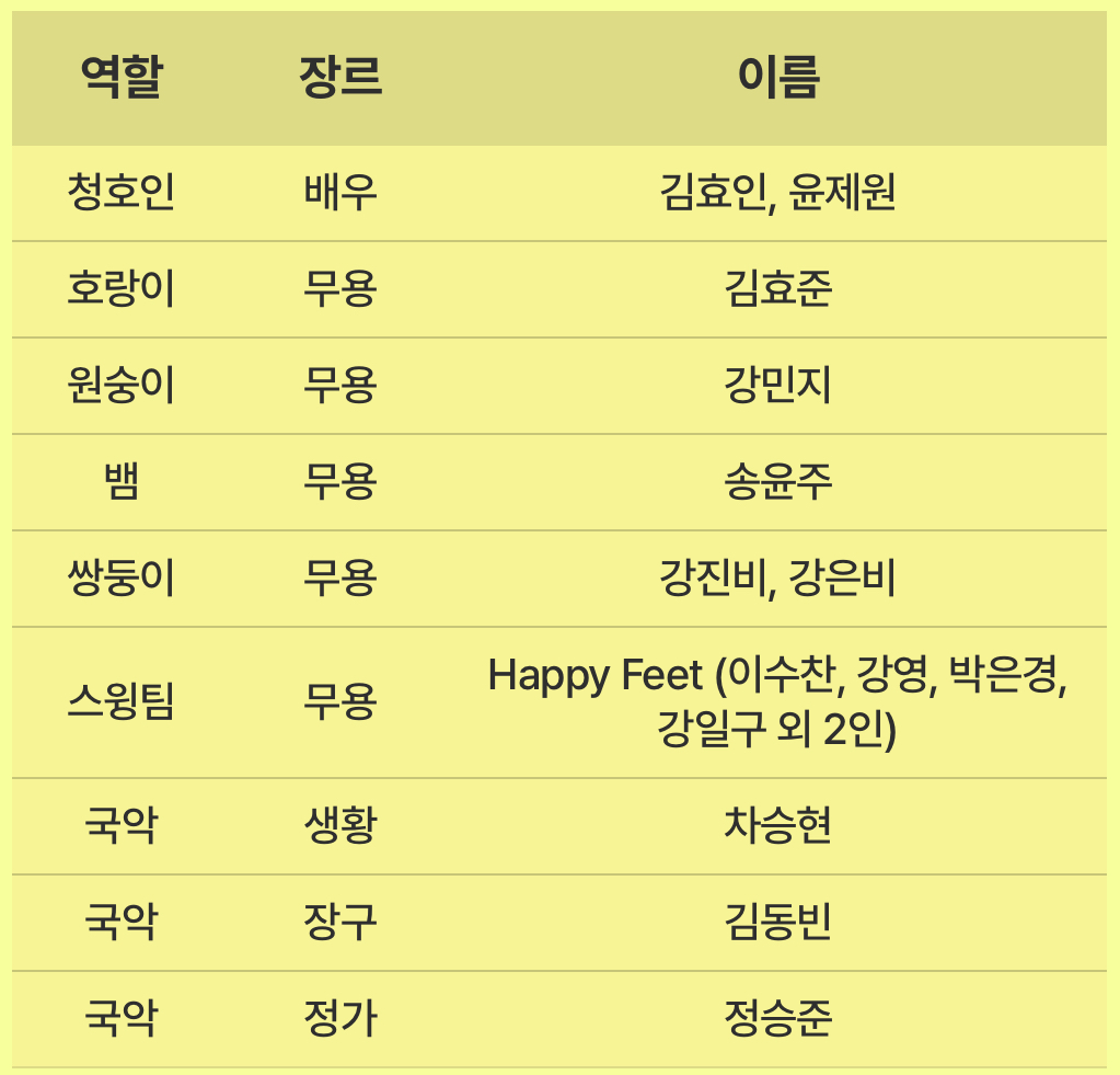 출연진은 아래와 같으니 참고하시기 바랍니다.
